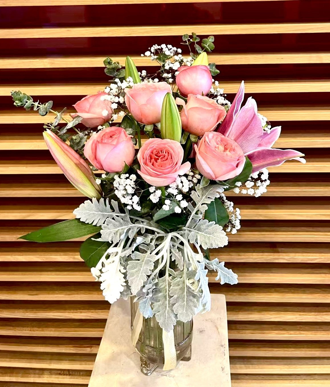 The colour, flowers and foliage designed and vase used will be curated by our florist.